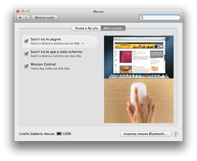 Nessun problema invece con i comandi touch e le gesture che funzionano alla perfezione. La superficie superiore estremamente liscia produce meno attrito del Magic Mouse di Apple, così scorrere le pagine dall’alto in basso oppure scorrere con due dita a destra e sinistra risulta estremamente naturale. In realtà Logitech Ultrathin Touch Mouse supporta un numero superiore di comandi rispetto persino al Magic Mouse di Apple. Oltre al clic destro e sinistro infatti il mouse di Logitech accetta anche un terzo click centrale che può essere abbinato a svariate funzioni a scelta tra lente di ingrandimento, Smart Zoom, Exposé, Cerca e Launchpad.