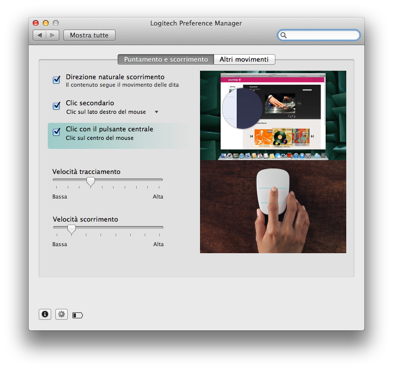 Una volta stabilito il collegamento Bluetooth con il Mac è possibile iniziare a usare immediatamente Logitech Ultrathin Touch Mouse. In questo modo però sono supportate solo le funzioni touch basilari (click sinistro e destro e scorrimento con una oppure due dita). Per iniziare a sfruttare al meglio il mouse occorre scaricare da questa pagina del sito web Logitech il software Logitech Preference Manager, disponibile sia per Mac che per PC.