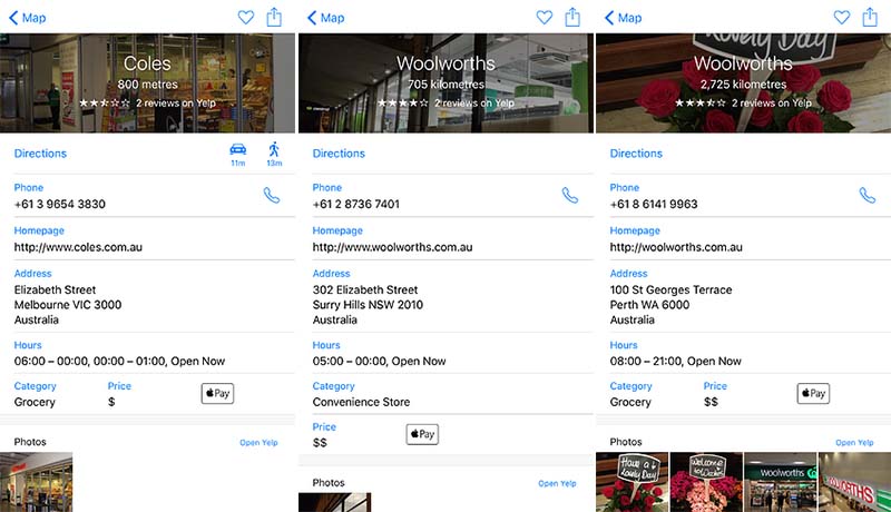 Il badge di Apple Pay per i supermercati Coles e Woolworths è indicato come riferimento di città quali Brisbane, Melbourne, Perth e Sydney. In altri store elencati il badge non è riportato, e neanche in grandi catene australiane come quelle di McDonald’s, e non è dunque chiaro se il logo indicato è un errore o semplicemente l’indicazione dell’imminente arrivo del servizio in Australia.