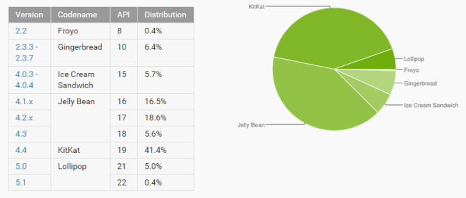 Mentre le adozioni di iOS 8 salgono al 77%, sul versante Android l’ultima release di sistema, nota con il nome di Lollipop, è installata solo sul 5,4% dei dispositivi. La percentuale scende drasticamente se si tiene in considerazione l’ultima build, invero Android 5.1, installata solo sullo 0,4% dei dispositivi di BigG.