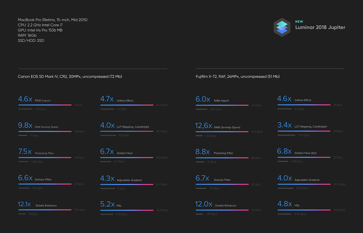 Tra le novità da segnalare, la velocità di editing in tutte le aree di Luminar. Ora le immagini si più velocemente, i filtri si applicano più rapidamente e l’intera applicazione è più reattiva. Per quanto riguarda la conversione RAW è integrato un migliore sistema calcolo dell’esposizione, i gradienti sono più puliti (è stata migliorata la procedura di demosaicizzazione). Se un’immagine presenta aree con un contrasto elevato, l’opzione migliorata di di Defringe aiuterà nelle zone retroilluminate o con forte contrasto.