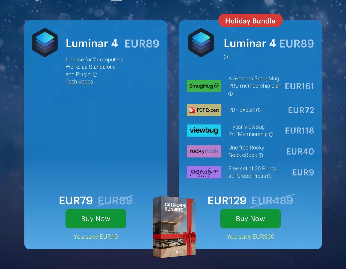 E’ inoltre possibile acquistare la Luminar Holiday Bag, un pacchetto del valore di 489 euro che per l’occasione viene proposto a soli 129 euro, che comprende: abbonamento di 6 mesi a SmugMug Pro, abbonamento annuale per Viewbug Pro, la licenza completa per PDF Expert, l’eBook Rocky Nook e 20 stampe gratis su Parabo Press.
