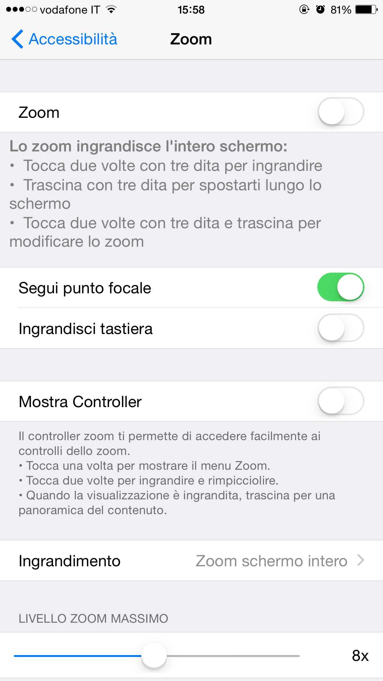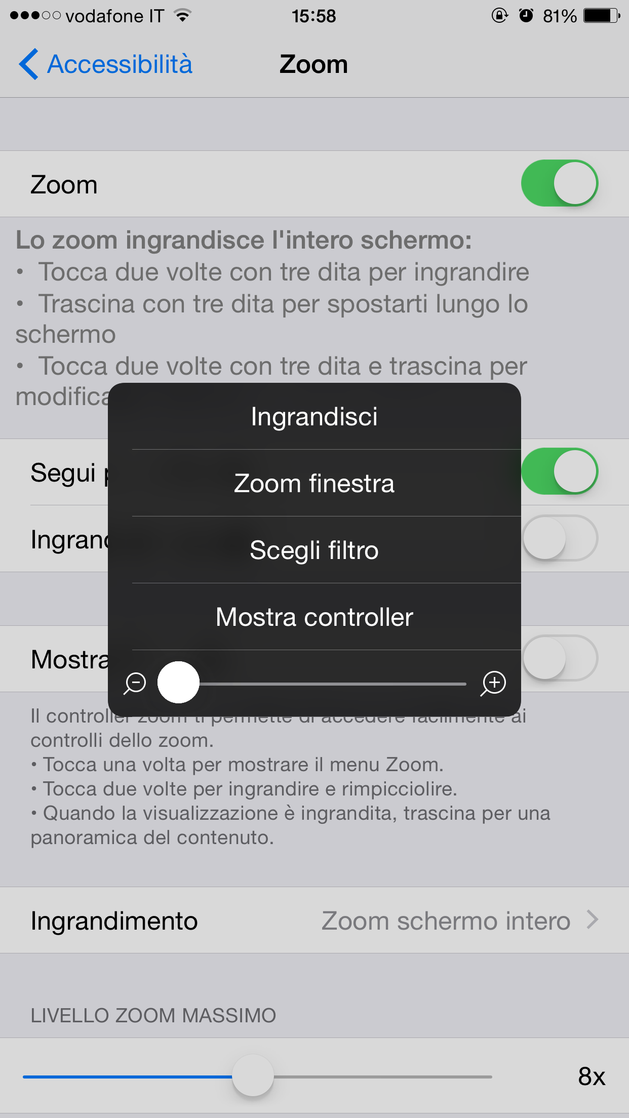 Utile soprattutto la notte o al risveglio, per non restare traumatizzati dalla luce del display sempre troppo forte quando la vista si è abituata all’oscurità, per attivarlo è sufficiente recarsi in Impostazioni > Generali > Accessibilità > Zoom ed attivare l’interruttore apposito relativo allo Zoom. Comparirà un riquadro che simula un ingrandimento: eseguite al suo interno un triplo tap con tre dita per aprire un menù extra.