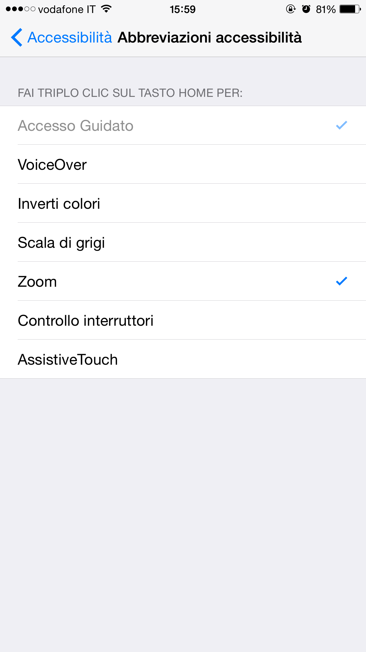 A questo punto tornate indietro, alla scheda Accessibilità, e scendete in basso per accedere alla scheda Abbreviazioni accessibilità ed impostate la voce Zoom. Fatto. A questo punto, al triplo click del tasto Home potrete ridurre la luminosità oltre il minimo concesso. Non ci credete? provate ad aprire il Centro di Controllo, riducete la luminosità al minimo, quindi eseguite un triplo tap per vedere diminuire ulteriormente la luminosità. Per tornare allo stato “normale”, di nuovo un triplo tap per disattivare la funzione.