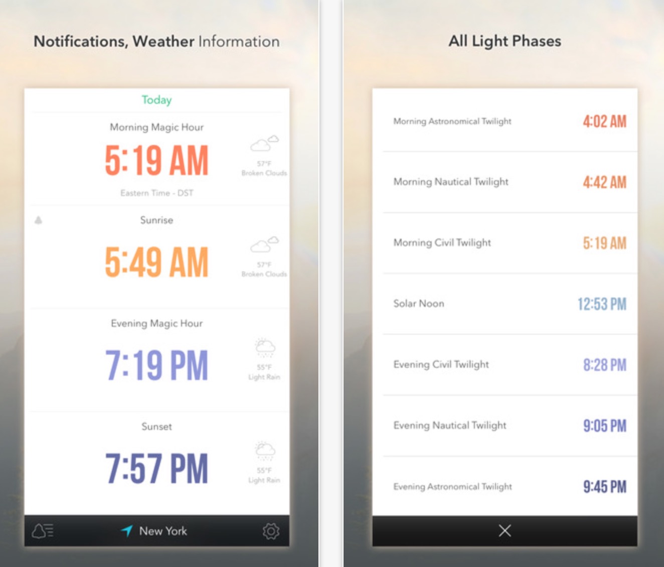 Lumy è tra le applicazioni più utili ai fotografi che desiderano scattare le fotografia perfetta in quanto si preoccupa di segnalare quando sta per iniziare l’ora d’oro. Questo particolare momento rappresenta sostanzialmente il breve periodo di alba e tramonto la cui durata varia sostanzialmente dalla stagione e dalla latitudine in cui ci si trova ed è influenzata dal meteo del momento.