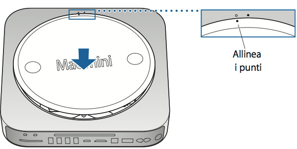10 – Rimontate la copertura inferiore utilizzando i puntini di allineamento per collocarla in posizione di sblocco. Non collegare il cavo di alimentazione e non accendere il Mac mini finché non avrete sostituito il coperchio inferiore. Non utilizzare il Mac mini se il coperchio non si trova al suo posto.