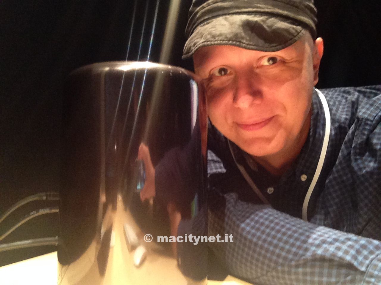 Apple non era ancora quella di oggi, l’azienda che finisce sulle prime pagine dei quotidiani ad ogni respiro, ma noi eravamo là (nella foto sotto il nostro Antonio Dini osserva un prototipo del Mac Pro) e fummo decisamente impressionati, e con noi tutto il mondo della tecnologia, mentre gli utenti professionali non vedevano l’ora di provarlo.