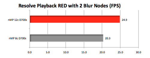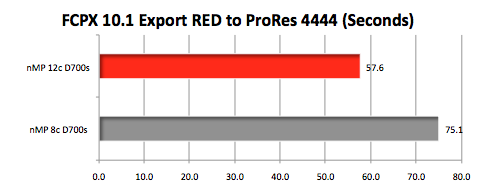 Nel primo test con DaVinci Resolve si evidenziano le maggiori prestazioni della macchina 12 core ma nonostante il numero inferiore di core, la macchina con 8 core si difende bene. Anche i benchmark concernenti le funzioni di esportazione da Resolve in ProRes 4444 hanno evidenziato numeri migliori (17.8 secondi contro 25.1) per le macchine da 12 core; stesso discorso per le esportazioni da FCPX da RED in ProRES 4444 (57.6 secondi contro i 75.1 della macchina 12 core).