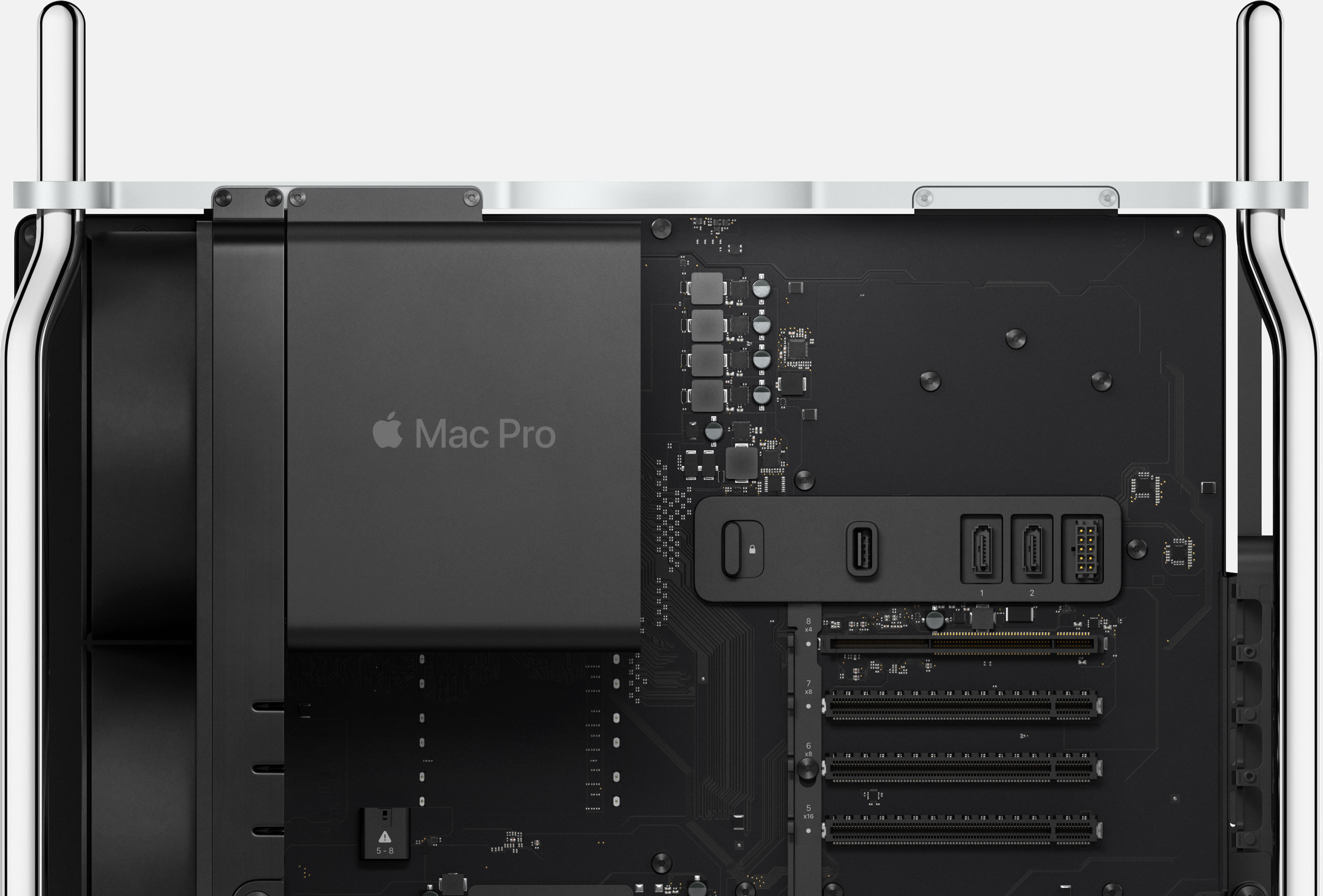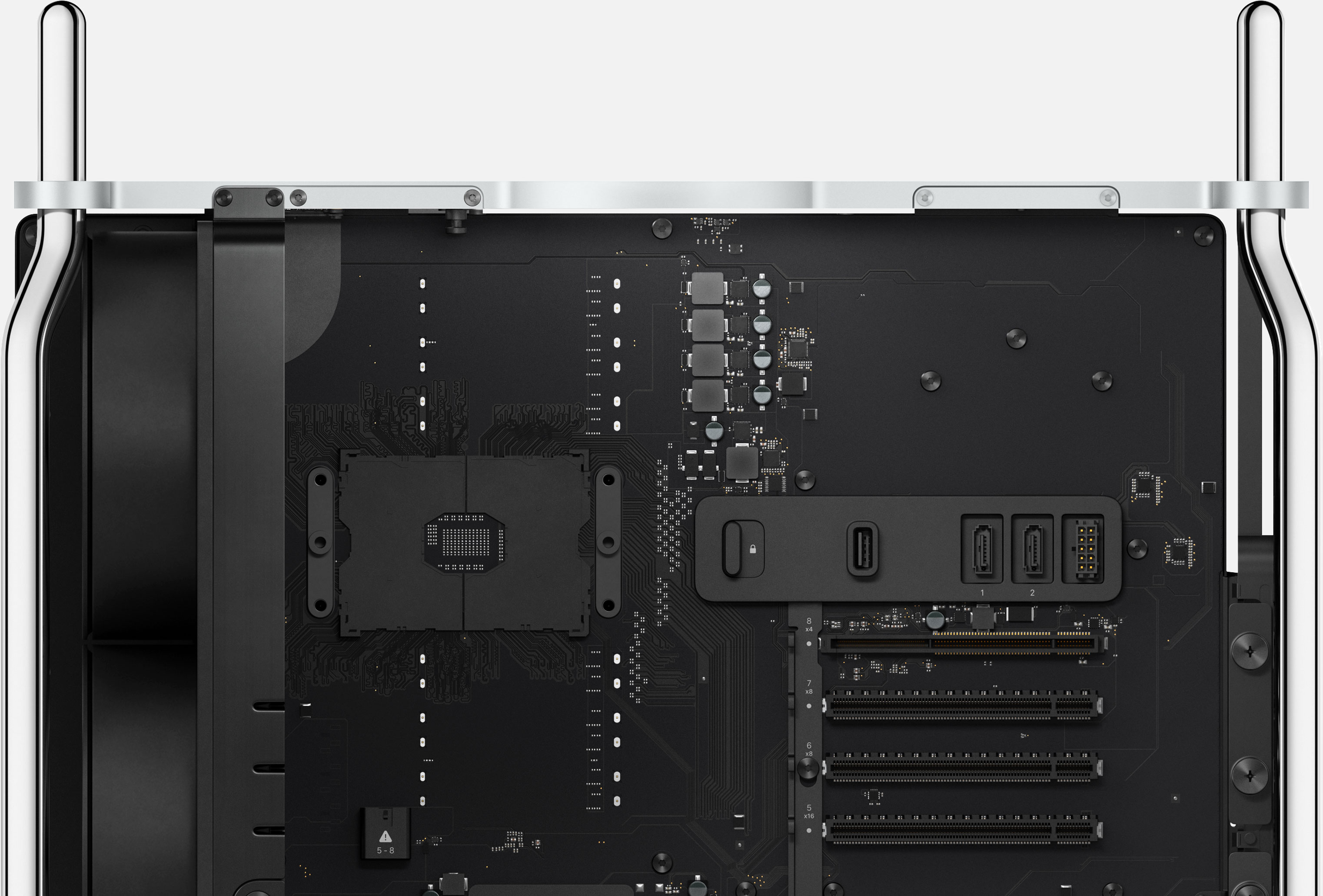 Apple ha scelto processori su socket o slot. Dalla foto della scheda logica si vede un socket con i tradizionali fermi sulla piastra di carico che consente di collocare il processore sopra i contatti ed evitare la saldatura. In teoria dovrebbe essere dunque possibile cambiare il processore o ad ogni modo sostituirlo in caso di problemi, senza bisogno di cambiare tutta la scheda logica che a sua volta dovrebbe ovviamente configurazioni con le varianti dello Xeon W.