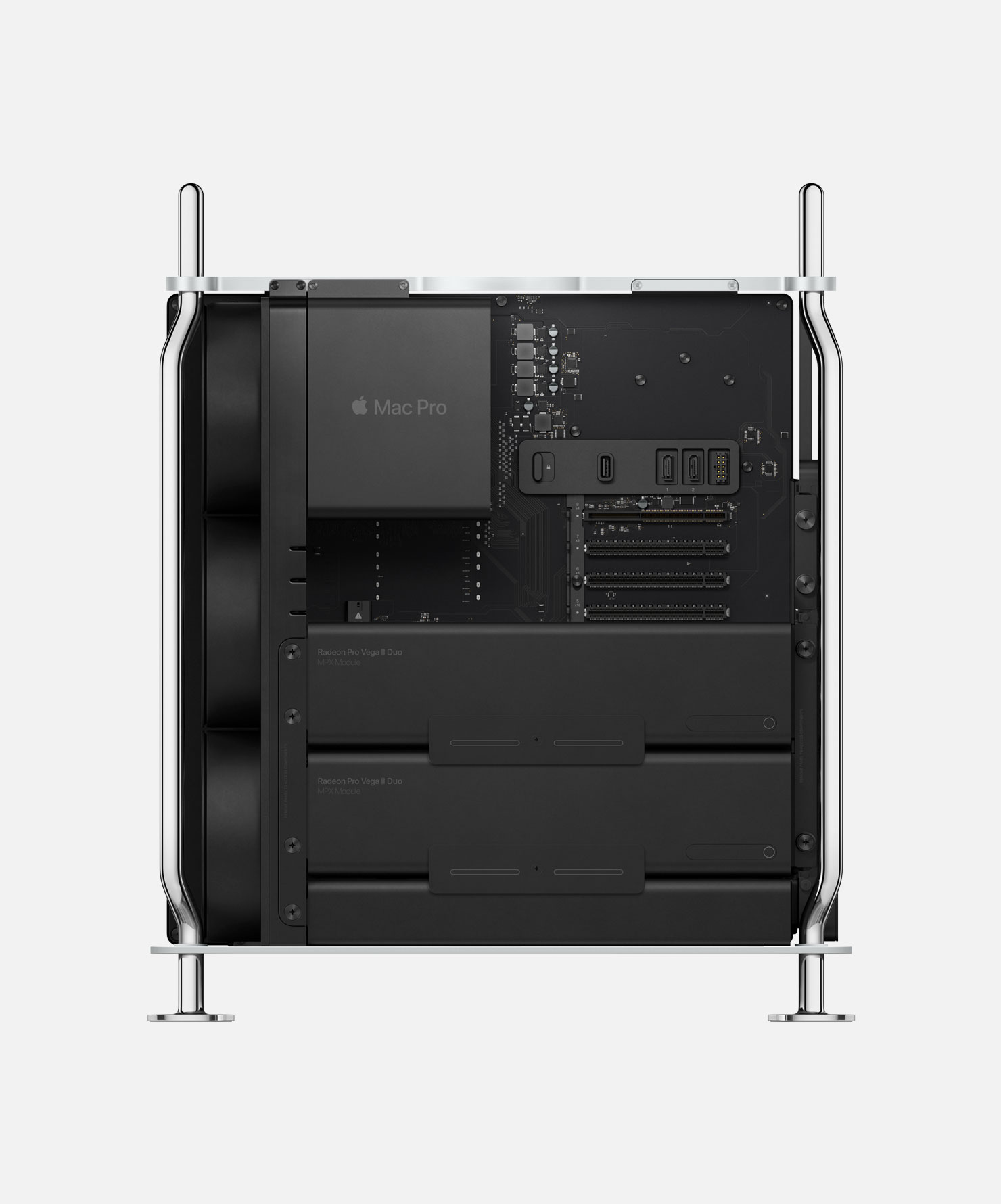 L’AMD Radeon Pro Vega II Duo integra due GPU ognuna delle quali offre 64 unità di calcolo, 4096 stream processor, 64GB di memoria HBM2 (32GB per GPU) con larghezza di banda fino a 1TB/s, supporta fino a 14,1 teraflop in singola precisione e 28,2 teraflop in mezza precisione. La connessione Infinity Fabric Link permette a due GPU Vega II di offrire connessioni fino a 84GB/s. Sulla scheda sono presenti quattro porte Thunderbolt 3 e una porta HDMI. Quattro connessioni DisplayPort sono dirottate al sistema a supporto delle porte Thunderbolt 3. Questa supporta fino a otto display 4K, quattro display 5K o quattro Apple Pro Display XDR con risoluzione 6K.