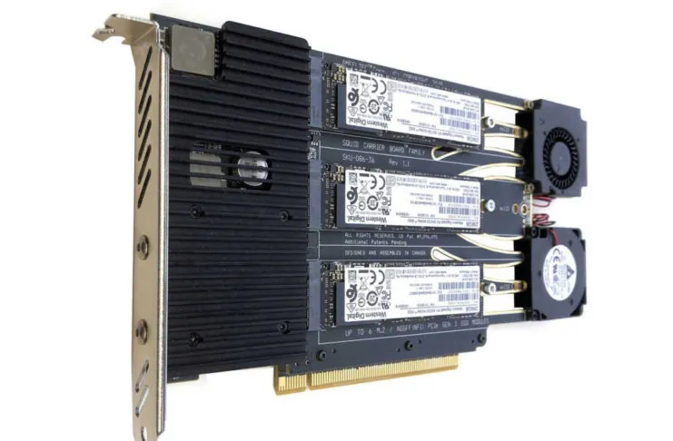 Come abbiamo già spiegato qui, la Sonnet M.2 4×4 PCIe è una scheda PCIe 3.0 a lunghezza intera con interfaccia a 16 linee (x16); vanta un bridge x16 PCIe di Sonnet che permette di dedicare la larghezza di banda di 4 linee PCIe 3.0 a ciascuna delle unità SSD installate e che, inizializzabili in configurazione RAID 0; permettono di offrire velocità di trasferimento di 8,500 MB/s e con l’aggregazione delle quattro unità è possibile arrivare fino a 12,000 MB/s. La scheda è compatibile Mac e PC. Su Mac è richiesto macOS 10.13.6 o versioni successive. È anche sfruttabile con box Thunderbolt 3 o Thunderbolt 2 che permettono di installare schede PCIe a lunghezza intera. La garanzia è di due anni.