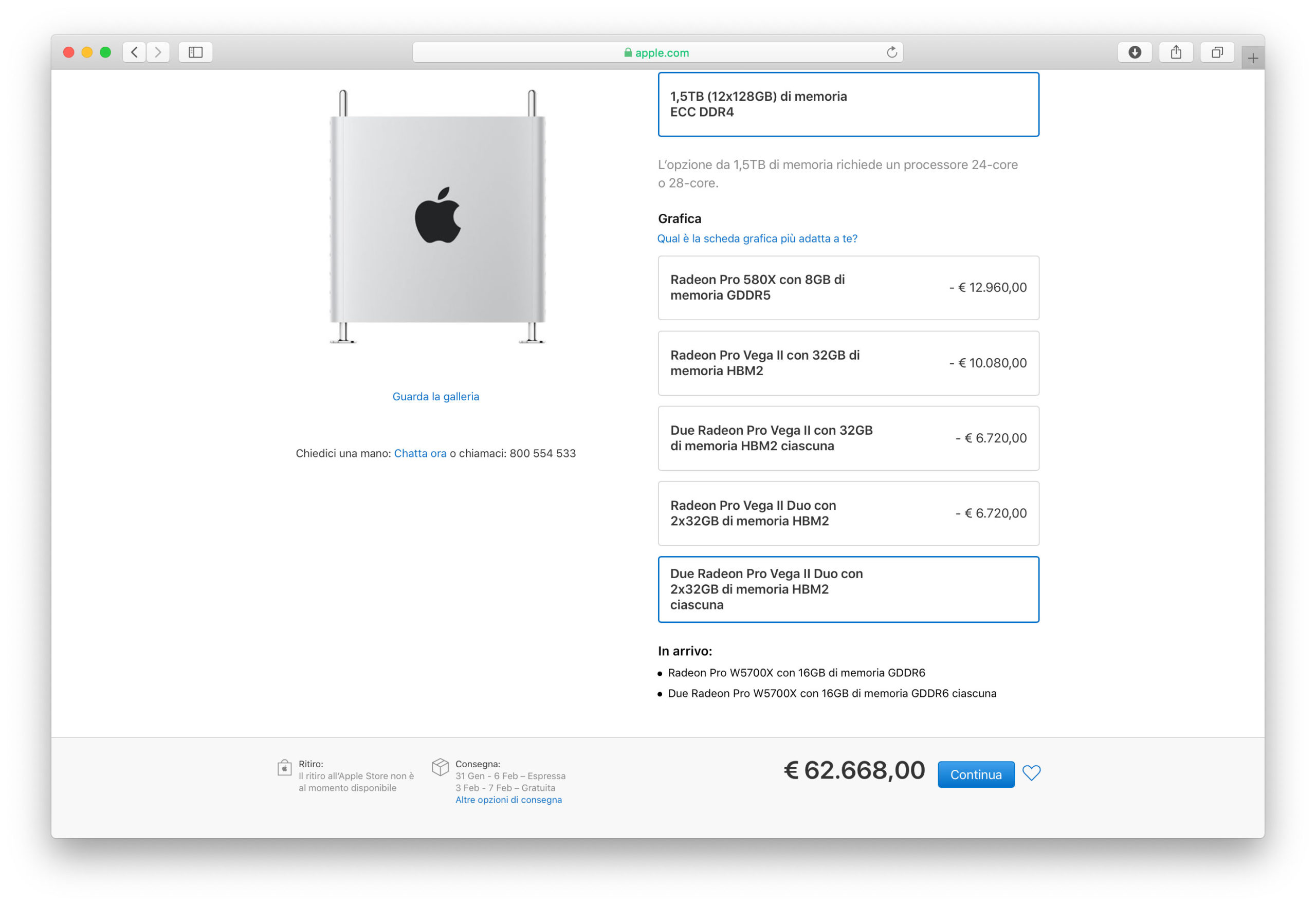 Configurando la macchina con tutte le opzioni possiibli, processore Intel Xeon W 28‑core a 2,5GHz – Turbo Boost fino a 4,4GH – 1,5TB di memoria RAM, due Radeon Pro Vega II Duo con 2x32GB di memoria HBM2 ciascuna, unità SSD da 4TB, scheda Afterburner, piedini e così via, si arriva a 62.668 euro. È ovvio che si tratta di macchine destinate a clienti particolari. E non dimenticate che se volete aggiungere un Pro Display XDR bisogna aggiungere altri € 5.599,00 euro per la variante con vetro base e 6599 euro per quella con vetro con nanotexture, A breve sarà disponibile anche la versione montabile a rack con prezzi che partono da 7.299,00 euro.
