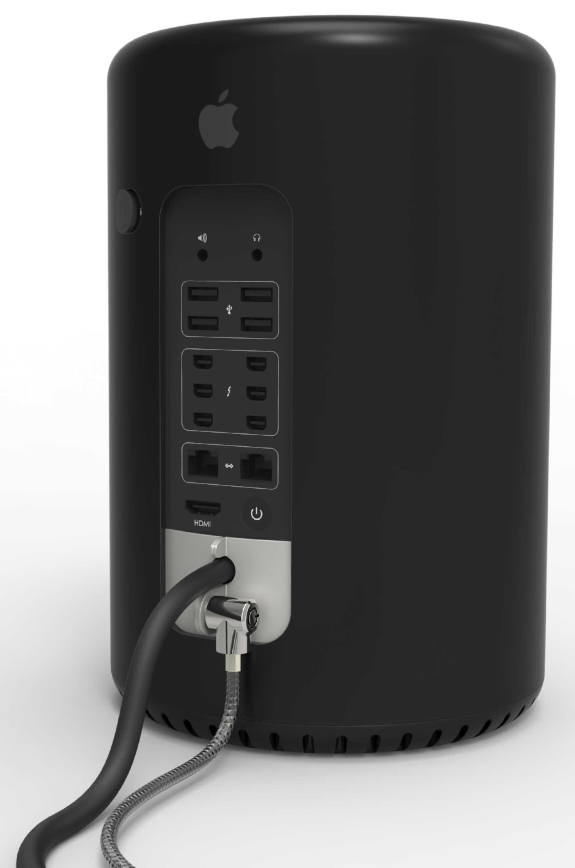 Il nuovo Mac Pro ha un form factor completamente diverso dai precedenti modelli: un design cilindrico nuovo, radicalmente differente da quello che c’era prima. Lo chassis dei precedenti modelli poteva essere bloccato sulla scrivania in diversi modi, usando cavi di sicurezza in acciaio completi di lucchetto; sui nuovi Mac Pro invece non è previsto un connettore Kensington per collegare cavi di sicurezza specifici, ma la società Maclocks propone un accessorio specifico, denominato Mac Pro Lock, in vendita a 66,34 euro con spedizioni previste dal 25 febbraio in poi.