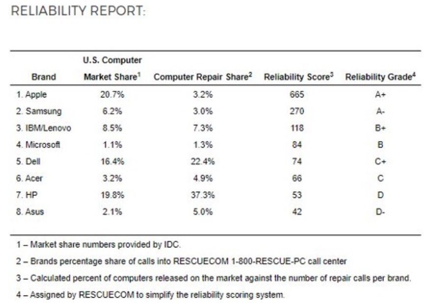 Gli appassionati Apple di lungo corso lo sostengono da sempre ma ora arriva anche una ricerca indipendente: secondo Rescuecom i Mac sono più affidabili di tutti i computer PC Windows dei principali marchi. Apple è l’unica società ad ottenere il voto A+ e un punteggio di affidabilità pari a 665. Per trovare il secondo piazzamento occorre scendere a 270 punti ottenuti da Samsung con una valutazione A-.