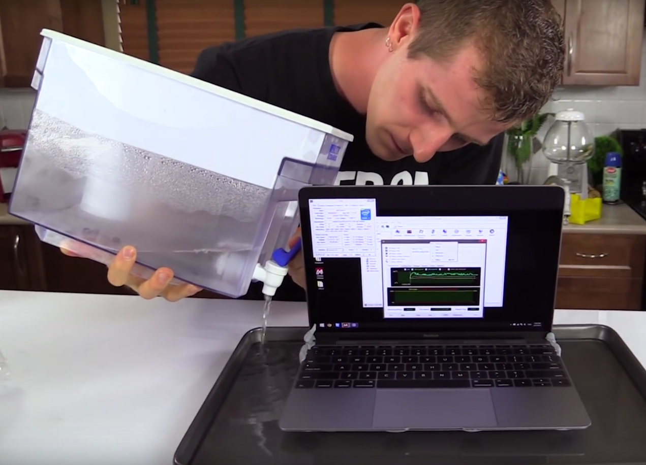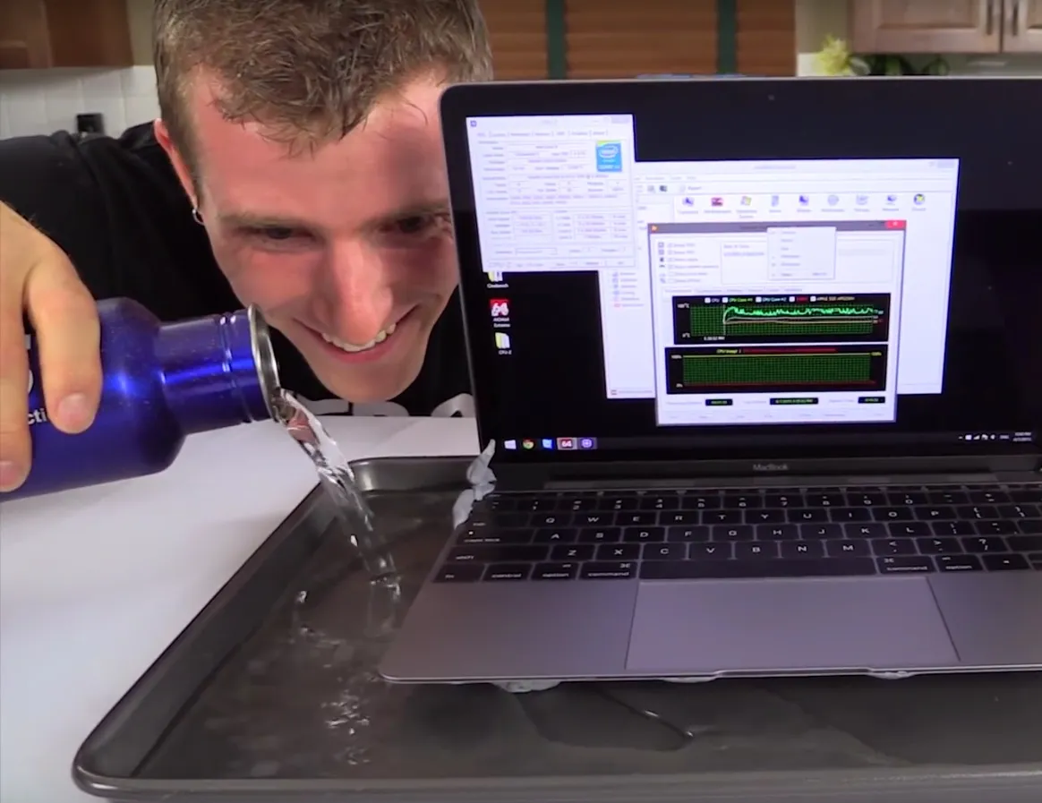 Apple ha studiato il sistema affinché ogni operazione venga svolta usando soltanto l’energia necessaria, riducendo costantemente la frequenza operativa di funzionamento quando non è necessario innalzarla. In virtù di quanto descritto non è, come già detto, certamente una macchina adatta a chi cerca prestazioni elevate. In teoria se il computer non riscalda troppo, il processore non ha bisogno di ridurre automaticamente la velocità operativa. Per verificarlo, qualche tempo addietro lo Youtuber LinusTechTips ha fatto un piccolo esperimento: ha sigillato per bene il MacBook 12″ e l’ha posto su un vassoio con acqua fredda, verificando che con il raffreddamento liquido è possibile raddoppiare le prestazioni con applicazioni quali Cinebench.