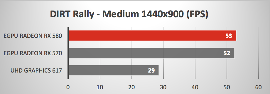 Anche il test con Dirt rally è stato eseguito sfruttando il Benchmark integrato e le impostazioni “Medium” con risoluzione 1440×900, disabilitando le opzioni Vsync e MSAA. La barra di colore rosso indica il dispositivo sul quale è stato ottenuto l’FPS migliore.