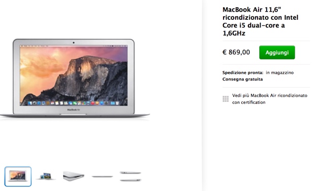 Per chi sta cercando un portatile Apple in offerta, su Apple Store online sono disponibili MacBook Air e Pro ricondizionati di ultima generazione scontati, a partire da 869 euro. Questo è il prezzo a cui è infatti proposto MacBook Air 11,6” in configurazione base, con processore Intel Core i5 dual core da 1,6 GHz, 4 GB di memoria RAM e unità SSD da 128 GB. Si tratta dell’ultima versione lanciata a marzo 2015 e attualmente a listino Apple, proposto nuovo a 1.029 euro, così grazie ai ricondizionati della Mela è possibile acquistarlo con un risparmio di 160 euro, pari a uno sconto del 15%.