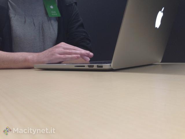 La risoluzione dello schermo è di ben 2560×1600 pixel pari a 227 pixel per pollice. Nel lato sinistro integra il MagSafe 2 per l’alimentazione, 2 porte Thunderbolt, una USB 3.0 e il connettore per le cuffie. Sul lato destro troviamo invece una seconda porta USB 3.0, l’uscita video HDMI infine l’alloggiamento per le schedine di memoria SDXC.