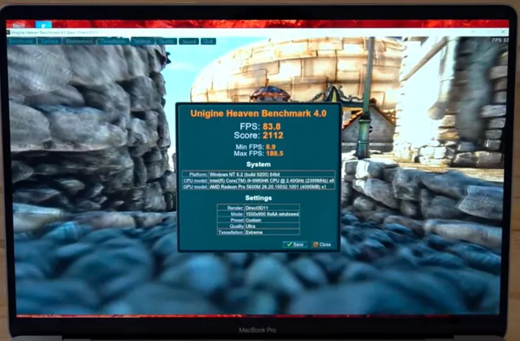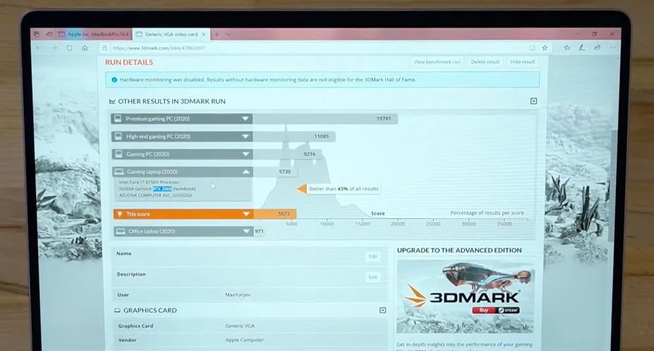 Con il test 3DMark eseguito su Windows, il punteggio ottenuto è 5.573, inferiori i 5.730 ottenuti con un laptop da 15″ specifico per il gaming presentato all’inizio dell’anno, l’Asus GU502GV con Core i7 e la GeForce RTX 2060 (il MacBook ha Il MacBook Pro da 16″ integra un intel Core i9 8‑core di nona generazione a 2,3GHz con Turbo Boost fino a 4,8GHz e in fase di ordine è possiible selezionare anche l’Intel Core i9 8‑core a 2,4GHz con Turbo Boost fino a 5,0GHz).