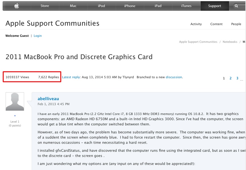 Numerosi utenti che hanno avuto la sfortuna di acquistare un MacBook Pro all’inizio del 2011, per un costo che partiva da 2.000 euro, si sono trovati con una macchina inutilizzabile. Per il momento sembra che non riescano a sortire alcun effetto le migliaia di segnalazioni sul forum di Apple e nemmeno le migliaia di firme raccolte tramite Change.org, quanto meno uno stranezza per una multinazionale che ha fatto della qualità dei propri prodotti e della centralità dell’utente la sua ragion d’essere.