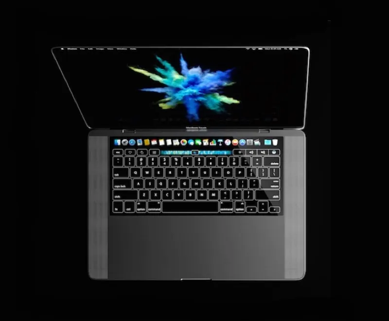 In MacBook Touch troviamo entrambe queste caratteristiche e anche qualcosa di più. Lo schermo principale mantiene l’elevata risoluzione dei Retina ma sostituisce il pannello LCD con un fantasmagorico AMOLED, come in iPhone X. L’eliminazione pressoché completa di bordi e cornici permette di integrare un display da 17” all’interno di un dispositivo con ingombri simili all’attuale MacBook Pro 15”.