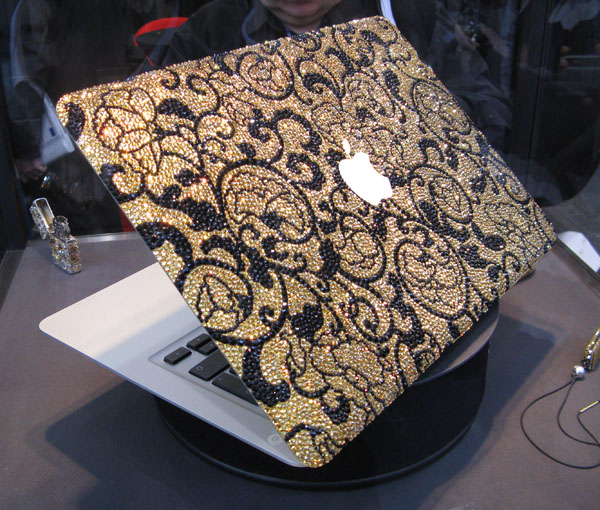 Il “modding” è di sicuro effetto e fa il paio con quello del TV a schermo piatto presente nello stesso stand e pure con quello della console Wii contenuta nella stessa teca ma le dimensioni e il design di MacBook Air esaltano l’intervento degli artigiani che hanno applicato 12.000 cristally Swarosky con un affascinante layout su un lamina d’oro.
