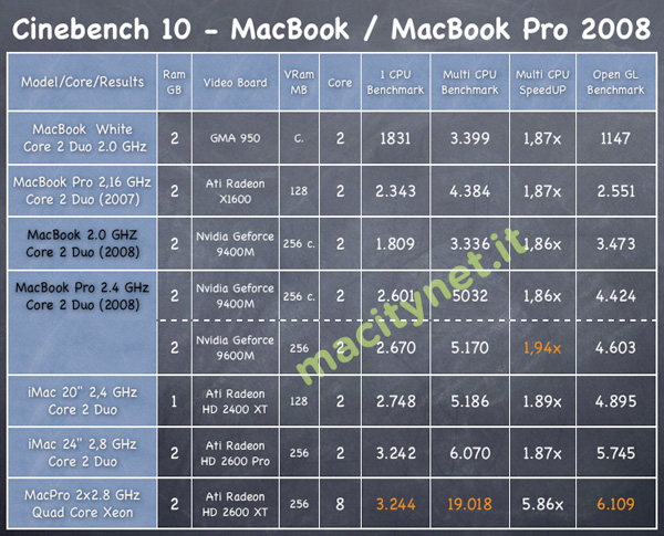 Confrontando il migliore risultato ottenuto dal nuovo MacBook “unibody” da 2,0 GHz e il MacBook Pro da 2.4 Ghz con macchine più datate otteniamo un quadro dei miglioramenti della potenza di calcolo pura del processore che non è esaltante e, sostanzialmente, in linea con la differenza di prestazioni tra i due processori.