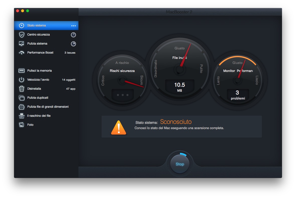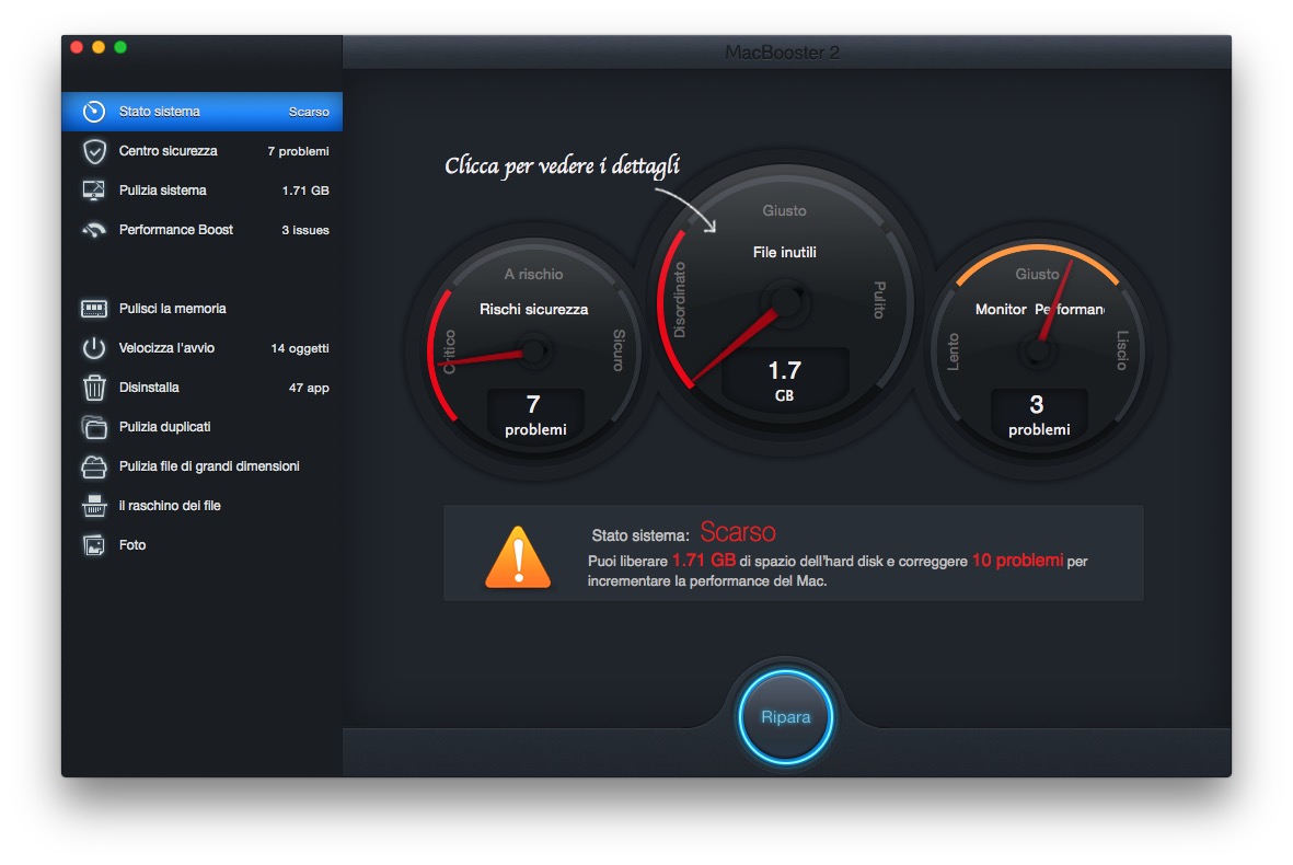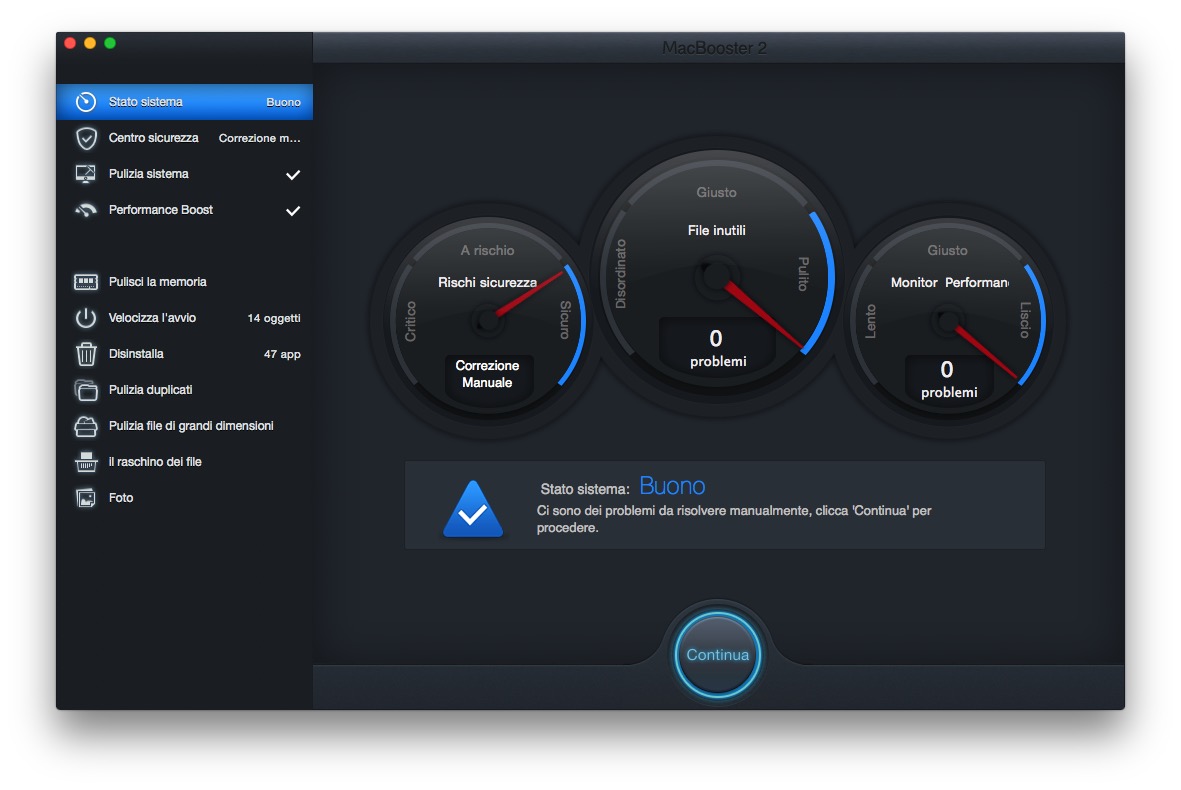 Nel nostro articolo abbiamo “vivisezionato” le funzioni di questa un’app che, in sostanza, è tutta dedicata a svolgere routines che permettono di affrontare problematiche comuni a tutti gli utenti e che non tutti possono risolvere facilmente come invece è possibile fare con MacBooster 2. Basta infatti avviare l’applicazione, cliccare sul pulsante “Scansione” ed attendere pochi minuti affinché il software rintracci tutti gli eventuali problemi che saranno indicati da tre “contachilometri”: che indicheranno prestazioni del sistema, rischi sicurezza, file inutili. A seconda di dove la lancetta si fermerà sapremo quanti problemi ci sono da riparare, come nel nostro caso che riportiamo nella galleria di immagini in calce all’articolo. Basterà un click per riparare automaticamente in meno di dieci minuti i problemi più semplici: alcuni andranno risolti manualmente, seguendo le indicazioni che riporterà il software guidando l’utente passo passo.