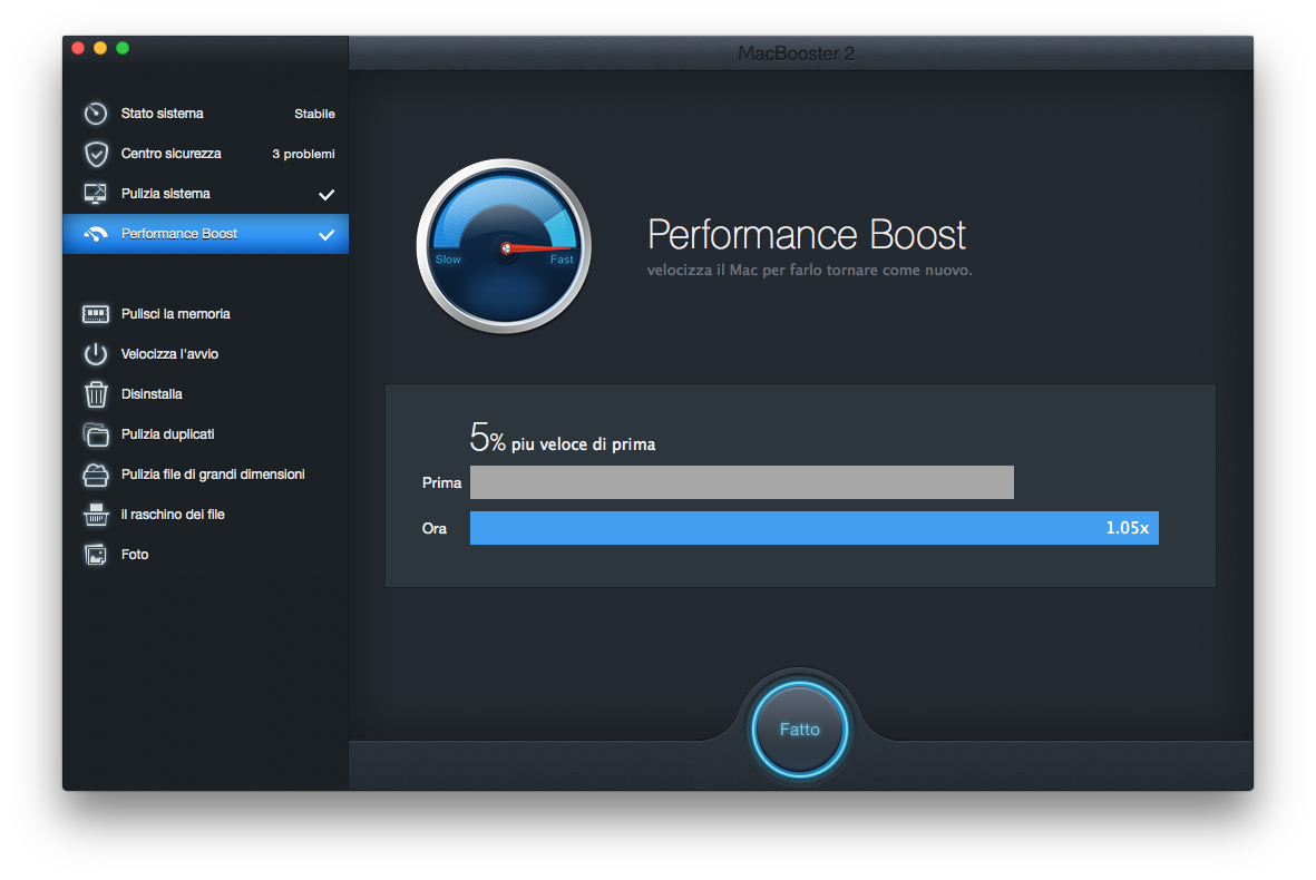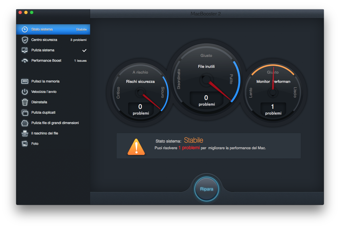 Avviando MacBooster 2 l’utente verrà a contatto con quella che può definirsi la schermata principale dell’intera applicazione. In questa finestra è possibile verificare lo stato generale del sistema, rappresentato da tra differenti pannelli a forma circolare. Un primo indica la quantità di file inutili presenti all’interno del disco fisso, il secondo individua rischi per la sicurezza e il terzo funge da monitor per le prestazioni del sistema. I tre pannelli funzionano esattamente come un qualsiasi conta chilometri analogico, dove la lancetta andrà ad indicare tre diversi stati di sistema per ogni segmento controllato. In questo modo, l’utente avrà immediatamente la possibilità di verificare la presenza di problemi all’interno della propria macchina. Inoltre, con un semplice click sul pulsante Ripara si avrà la possibilità di correggere tutti, o quasi, i problemi segnalati. Questo metodo completamente automatizzato risulta certamente veloce ed intuitivo, ma probabilmente converrà analizzare manualmente ogni singola problematica segnalata.