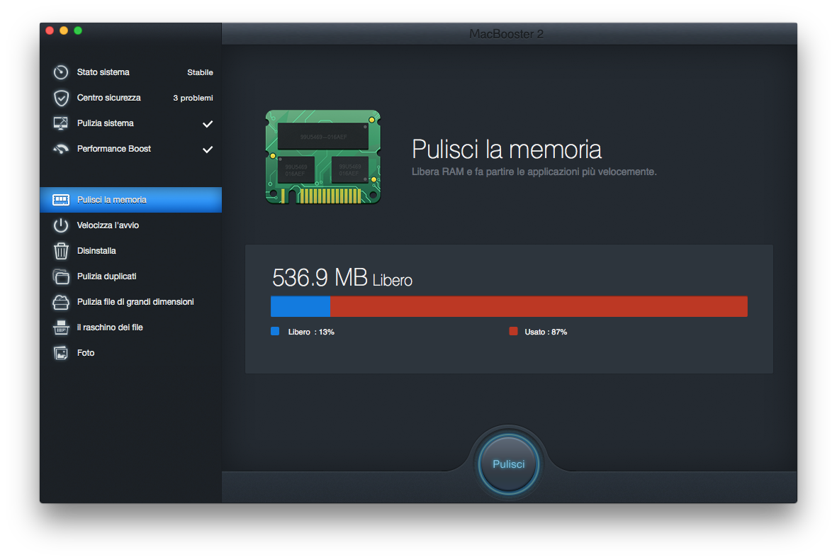 Attraverso il menù a tendina posizionato sulla parte sinistra dell’applicativo sarà anche possibile ripulire la RAM utilizzata dal sistema. Questa operazione risulta particolarmente utile quando si lavora al Mac per tante ore di fila senza spegnerlo o riavviarlo. Durante il giorno, infatti, parecchia RAM potrebbe essere occupata da applicazioni precedentemente aperte, non più in uso. ripulendo la memoria con un semplice click, Mac Booster 2 consente di velocizzare l’apertura e la reattività delle varie operazioni che si compiono con determinate applicazioni in uso. Ancora una volta, è sufficiente un solo click per ripulire la memoria e la schermata offerta mostra immediatamente all’utente quale sia la percentuale di RAM utilizzata, e quale quella libera.