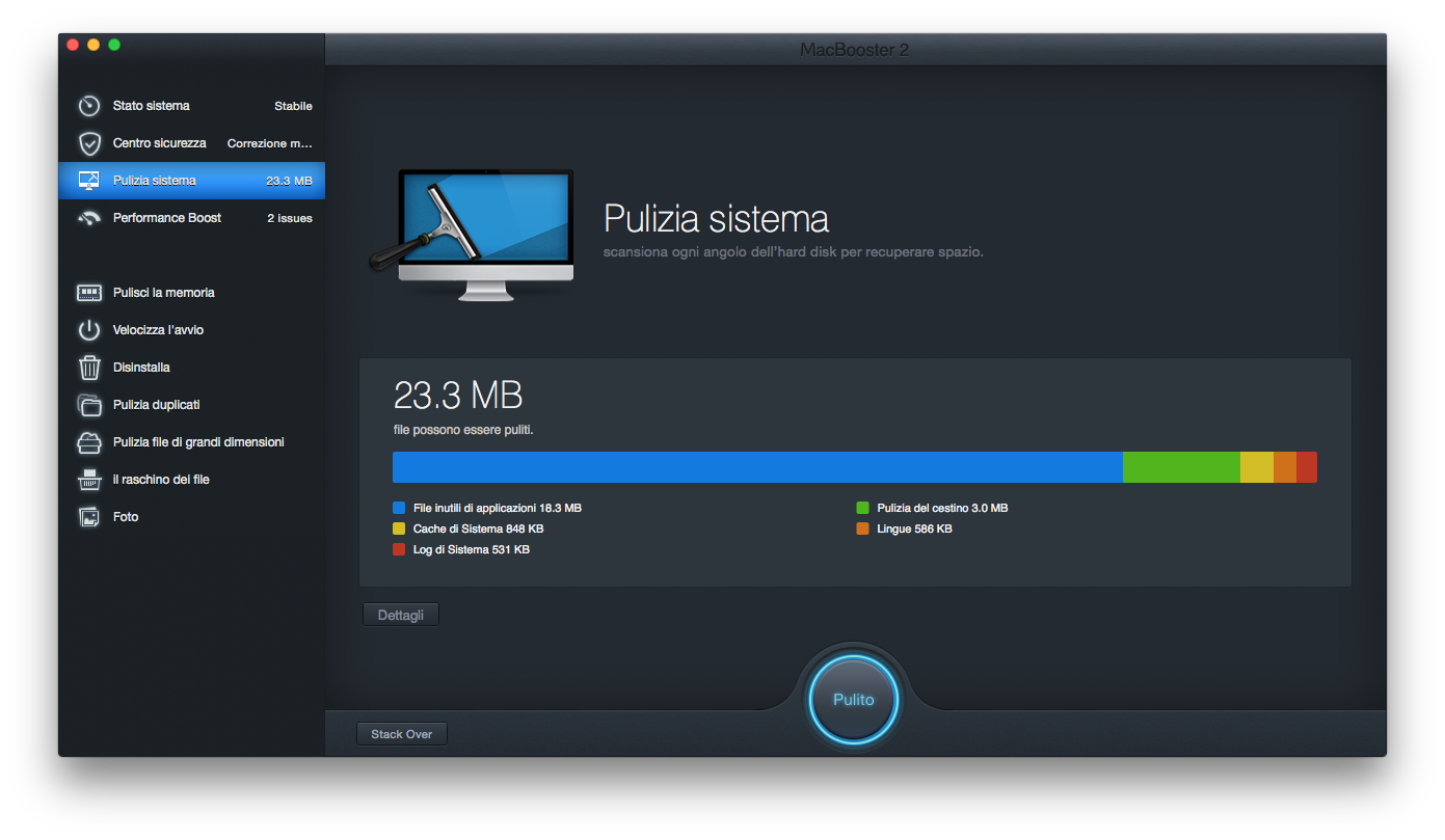 MacBooster 2 è il software che promette di velocizzare il proprio Mac, e in generale risolvere qualsiasi problema riscontrato sulla macchina, con semplici operazioni. In molto casi, basta addirittura un click. Si tratta di un applicativo estremamente semplice da utilizzare, che non necessita alcuna conoscenza specifica e, soprattutto, non richiede di effettuare operazioni dal finder o, ancora peggio, dal terminale. Insomma, un’interfaccia grafica immediata accoglierà l’utente per iniziare una scansione veloce e completa del Mac.