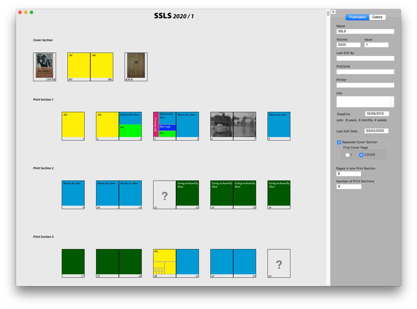 Tipicamente questa attività si svolge lavorando manualmente sul menabò del progetto grafico, annotando al volo le pagine completate, la sequenza di pubblicità e altri elementi di cui tenere conto. MacFlatplan consente di ridimensionare le pagine, specificare le sezioni da stampare e applicare schemi colore a 1/4, 1/2 o a tutta la pagina.