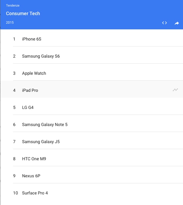 Al primo posto domina iPhone 6s, così come lo scorso anno in testa alla classifica c’era iPhone 6. Gli smartphone di Cupertino sono oggetto di culto fin dal primo iPhone del 2007 e dominano le ricerche online ancora prima di arrivare sul mercato, grazie a una mole impressionante di voci, aspettative, previsioni e indiscrezioni. Ma il titolo di Apple regina dell’hi-tech non è conferito solo per questa prima posizione.