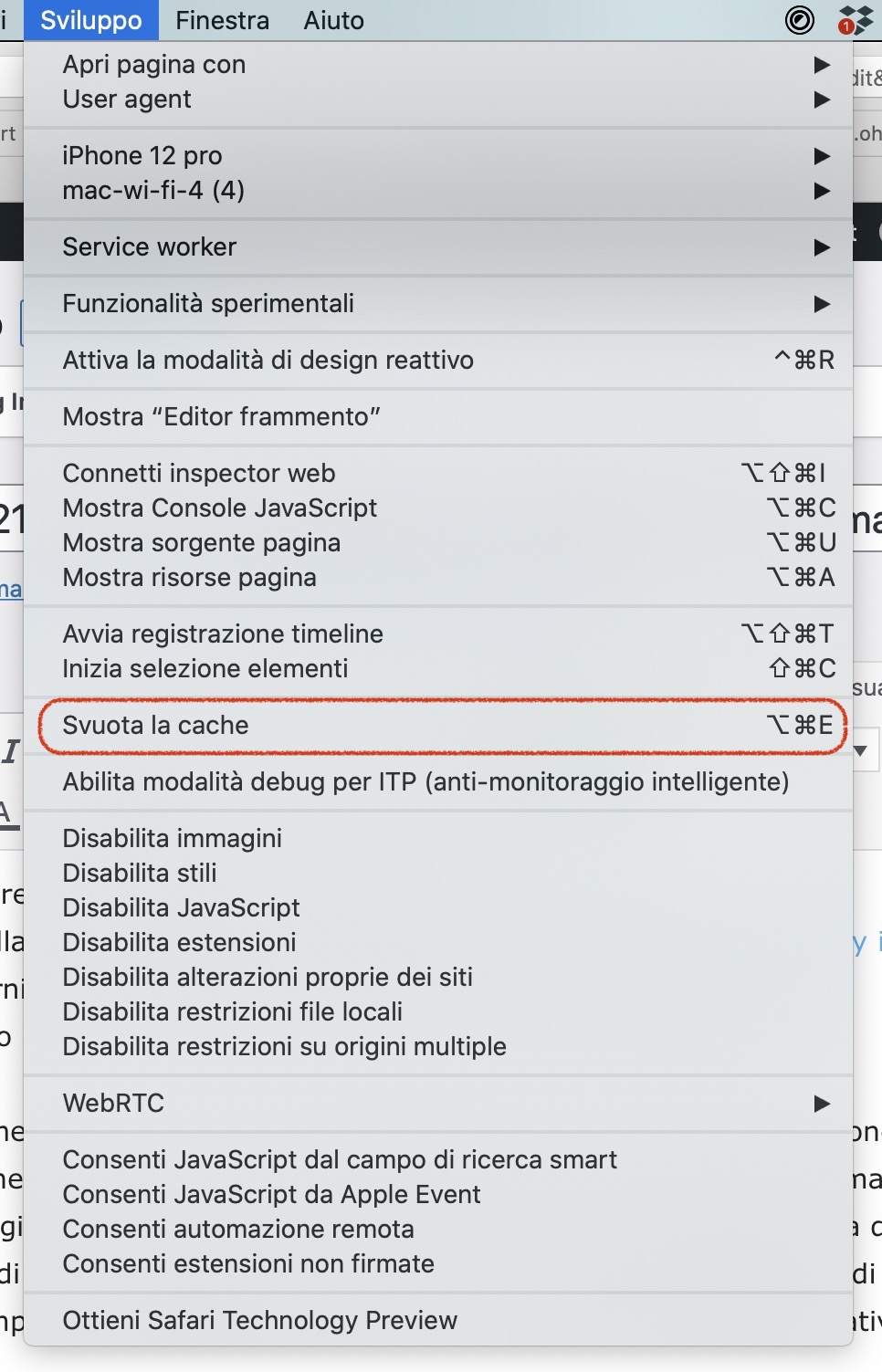 La soluzione è abbastanza semplice andare nel menu “Sviluppo” e scegliere la voce “Svuota la cache” oppure premere contemporaneamente [option] [command] [E], La pagina memorizzata erroneamente verrà cancellata e al prossimo reload o accesso al sito vi troverete di nuovo con la homepage aggiornata.