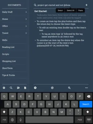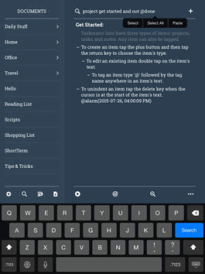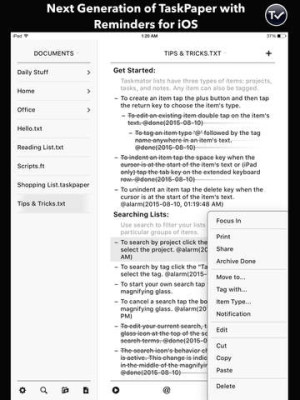 C’è la possibilità di personalizzare la tastiera, che offre anche una riga di caratteri aggiuntivi (per facilitare la formattazione del testo) e la modalità notturna di scrittura, che crea uno sfondo scuro e caratteri bianchi. Sono più interessanti, però, le funzionalità specifiche di Taskmator. Per i promemoria l’app consente di sincronizzare attraverso iCloud e modificarli con qualsiasi applicazione capace di editare il testo. Taskmator introduce una serie piuttosto ampia di possibilità per compiere le stesse azioni. Ad esempio, si può creare, cambiare o cancellare un promemoria utilizzando sia uno swipe sullo schermo che usando una tag (“@done”) o un comando da menu. Inoltre, da buon cittadino di iOS nella versione più moderna, Taskmator permette di seguire gli Url Scheme, di far aprire i documenti in altre app selezionabili dal menu delle esportazioni, oppure utilizzare AirDrop. In più, oltre alla status bar che permette di vedere tutte le statistiche del caso, ci sono funzionalità di ricerca, filtro del testo, gestione della struttura del testo o della gerarchia dei documenti creati, organizzabili con cartelle, e una serie di altre funzionalità che rendono Taskmator un software maturo, semplice da usare ma molto ricco e complesso.