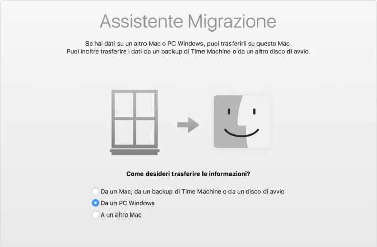 La prima volta che si accende il Mac, si apre automaticamente Impostazione Assistita. Se avete già configurato il Mac, è possibile aavviare Assistente Migrazione, disponibile nella sottocartella Utility della cartella Applicazioni. Basta seguire le istruzioni visualizzate sullo schermo finché non compare il pannello dell’assistente dedicato alla migrazione e selezionare l’opzione per trasferire le tue informazioni “Da un PC Windows” e fare clic su Continua.