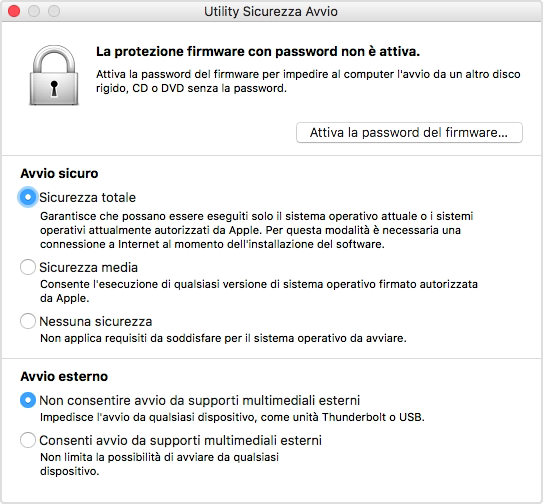 4) A questo punto (dalla sezione “Avvio esterno”) potete consentire l’avvio da supporti multimediali esterni, chiudere la finestra e riavviare il Mac con la chiavetta USB prima creata.