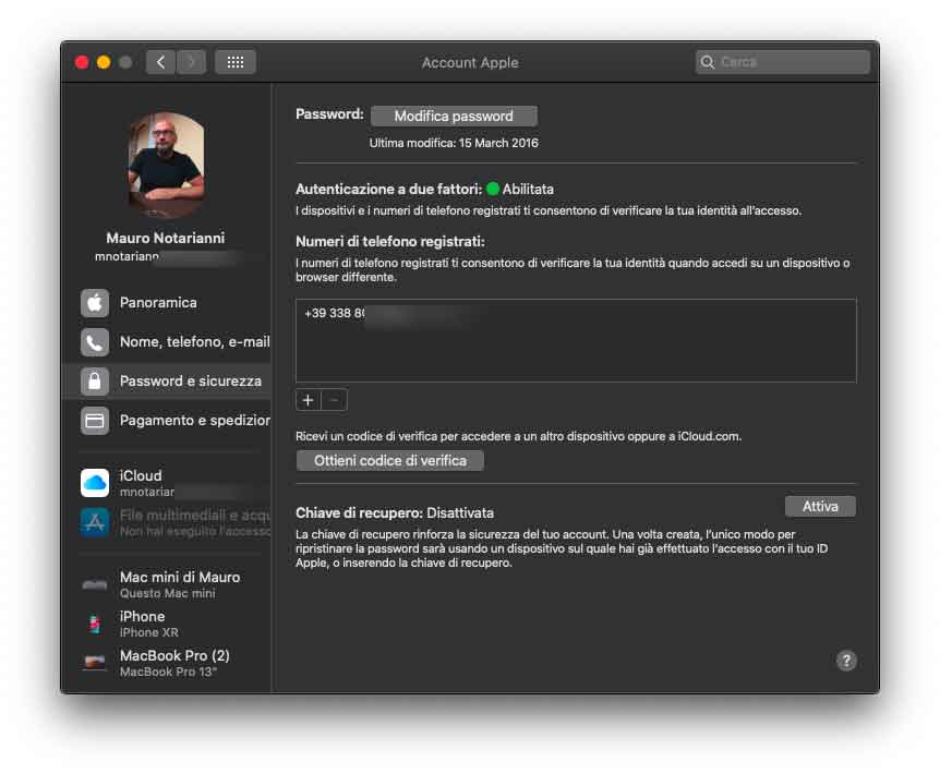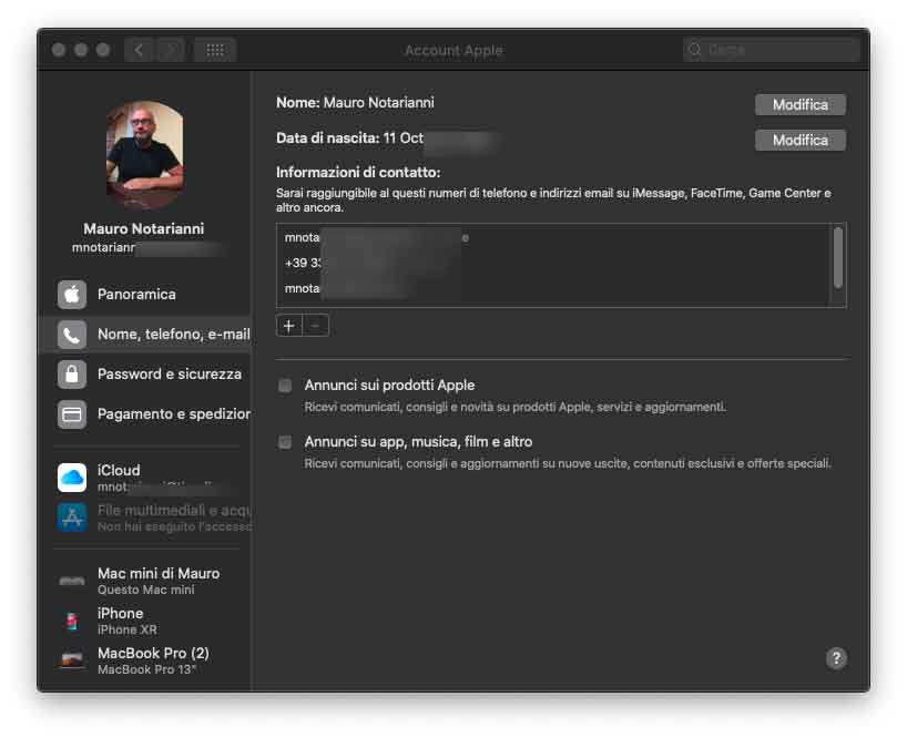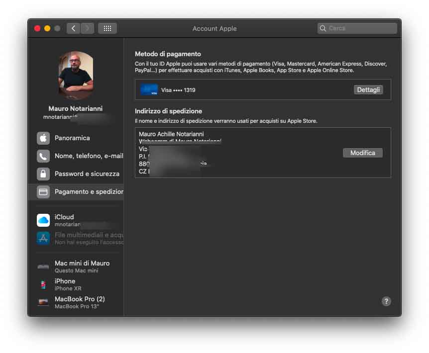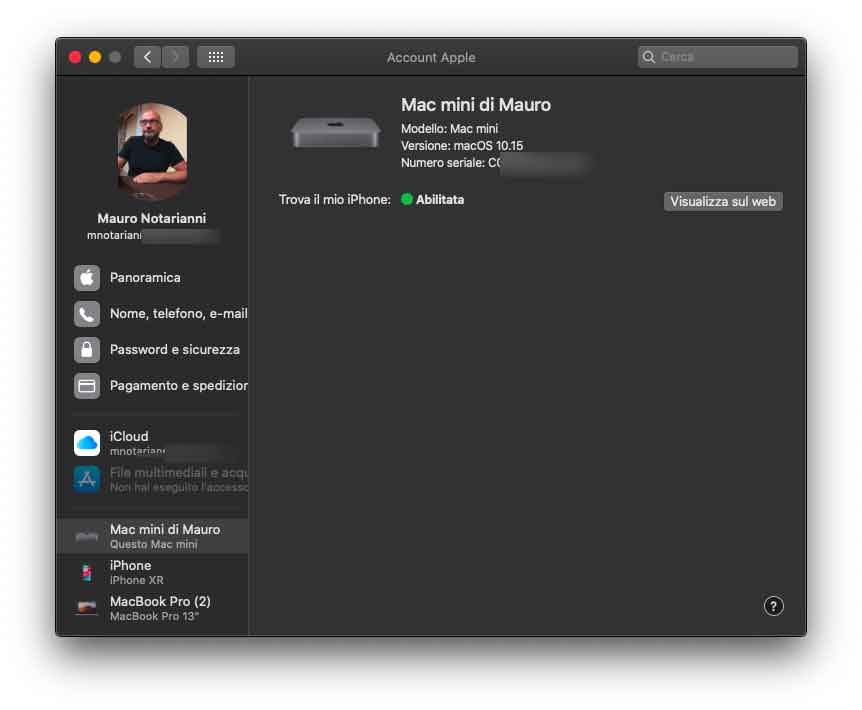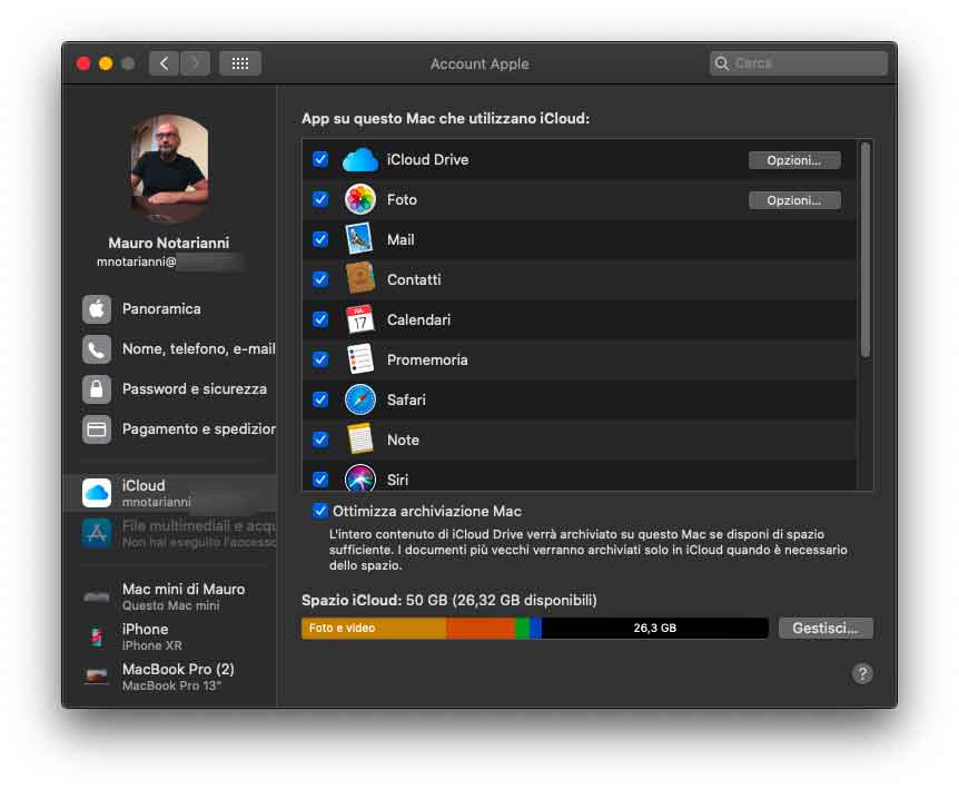 La sezione “Account” permette di avere una panoramica dell’account iCloud; da qui è possibile gestire l’account, visualizzare i dati elativi a pagamento e abbonimenti, regolare le preferenze iCloud per il Mac in questione e conoscere i dispositivi associati.