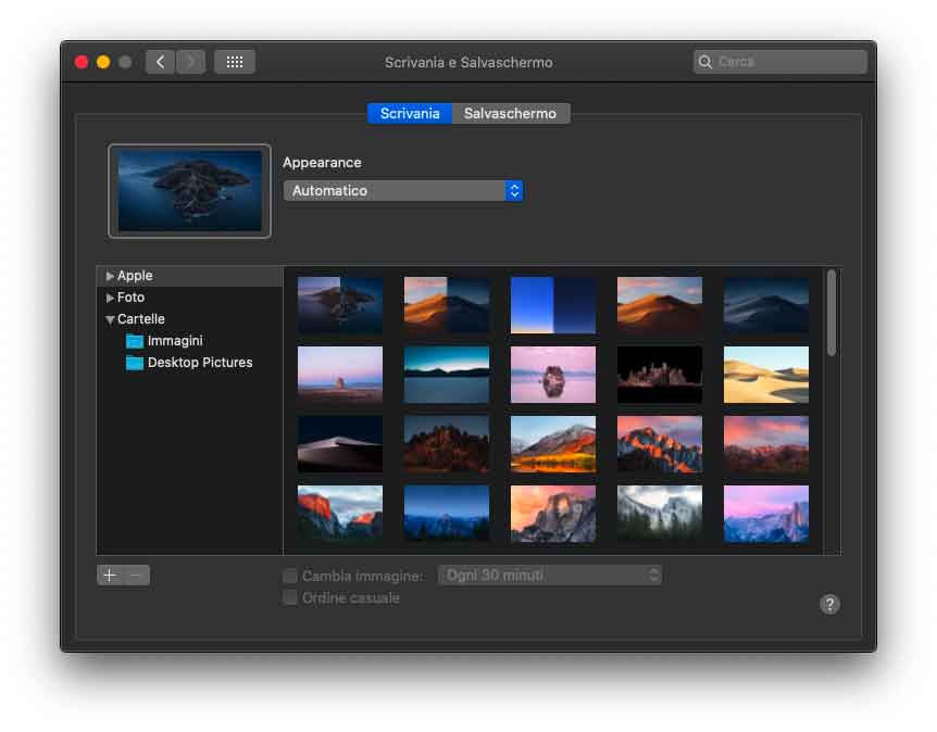 Nella sezione “Generali” delle Preferenze di Sistema è possibile selezione il come in macOS Mojave il tema scegliendo tra le voci “Chiaro”, “Scuro” e ora anche “Automatico”. La sezione “Scrivania e Salvaschermo” resta identica a eccezione dei nuovi sfondi di serie. La disposizione della sezione “Mission Control” è un po’ cambiata ma le opzioni sono quelle solite.
