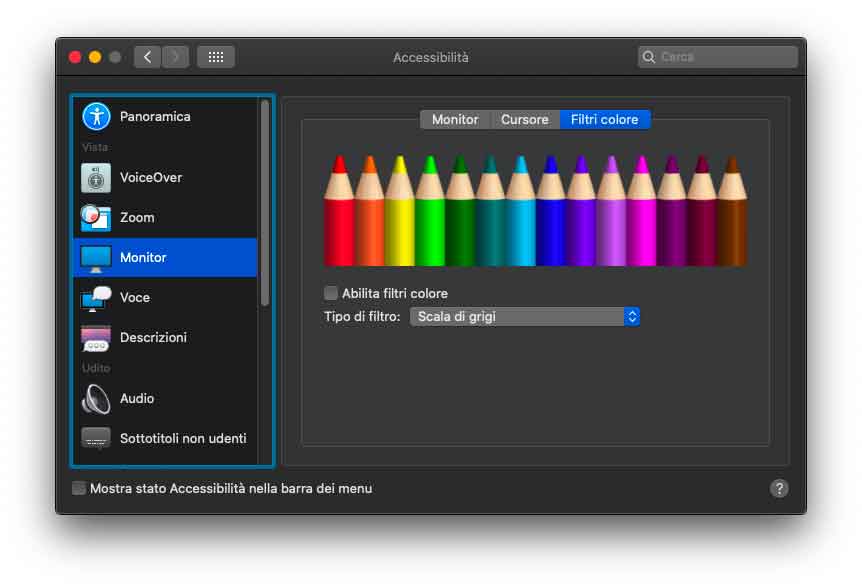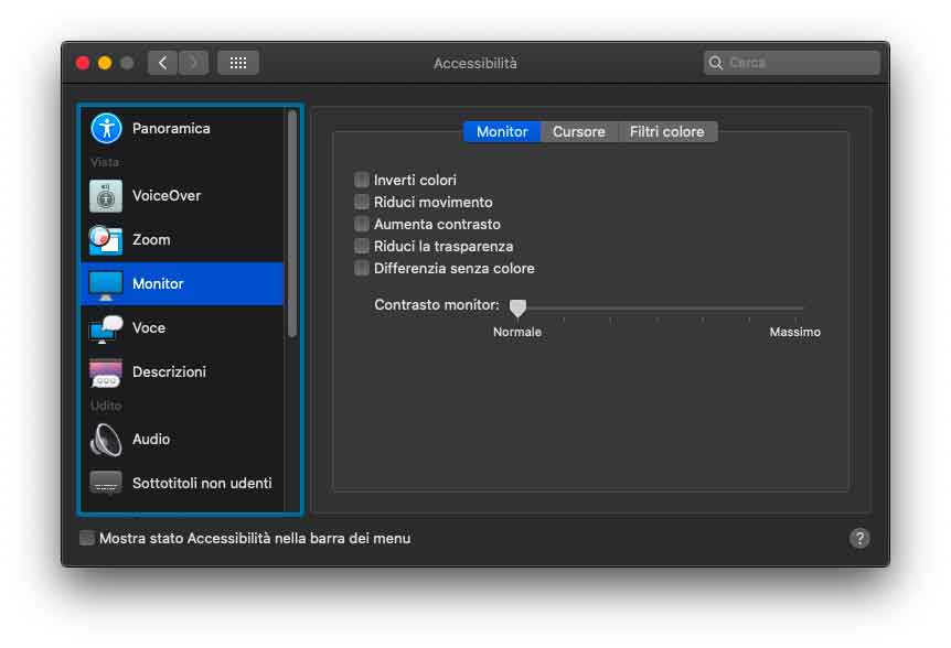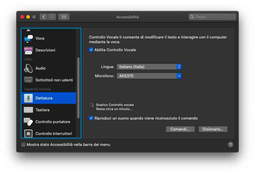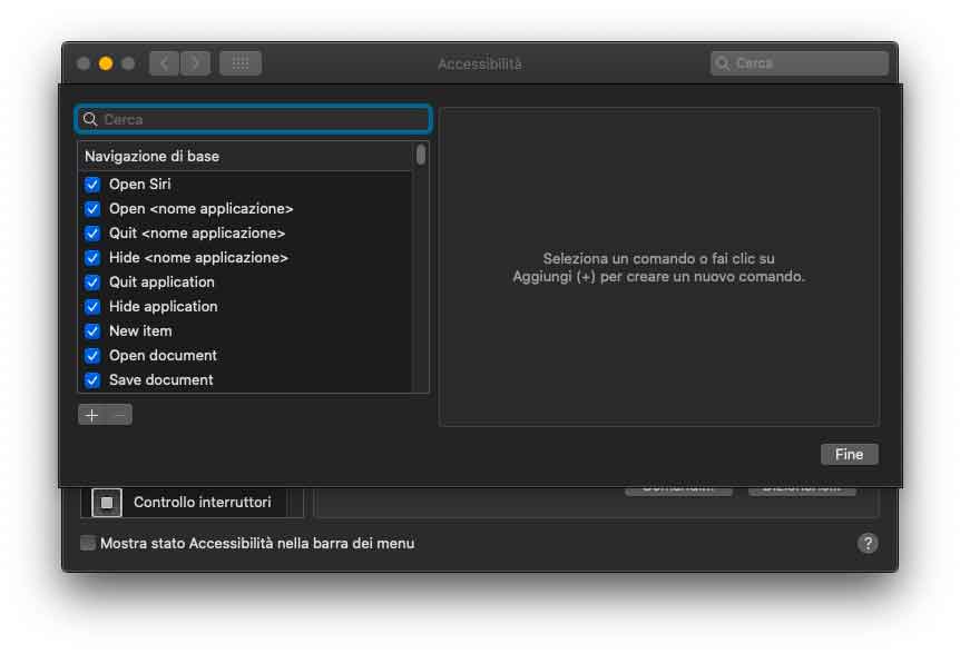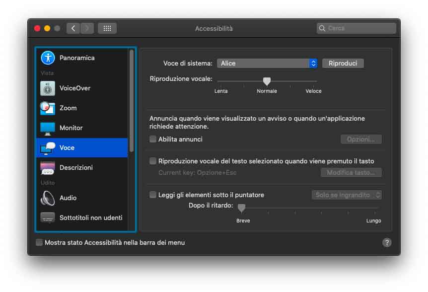 Nella sezione Accessibilità delle Preferenze di Sistema sono state riviste alcune voci. Nella sezione zoom è presente la voce “Ingrandisci testo al passaggio del cursore”, utile pe visualizzare il testo ingrandito sotto il cursore del mouse. Rivista anche la disposizione nella sezione “Monitor”. Sempre in Accessibilità, selezionando “Dettatura” è possibile abilitare il controllo vocale, opzione che consente di modificare il testo e interagire con il computer. Dopo aver attivato questa opzione nelle voci dei menu dei vari programmi, appaiono dei numeri che è possibile richiamare con la voce, velocizzando l’accesso. Semplice, veloce e funzionale.