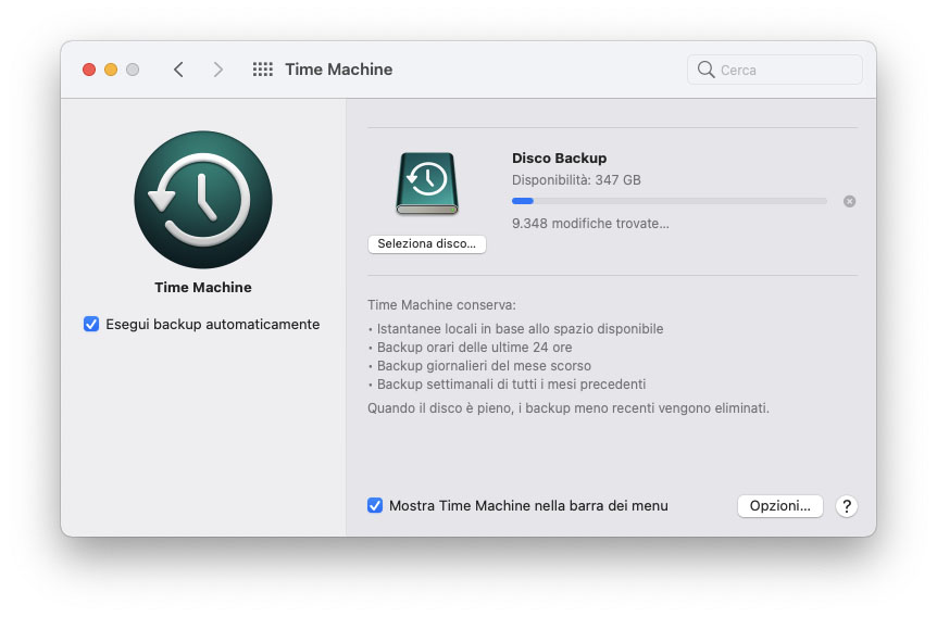 Un’altra novità meno evidente è che durante la fase di preparazione del backup, il pannello dedicato nelle Preferenze di sistema indica il numero di file modificati, una funzionalità legata probabilmente a caratteristiche intrinseche dei dischi inizializzati come APFS, formato supportato per i backup di Time Machine da macOS Big Sur. Con il nuovo filesystem è possibile ottenere svariate informazioni in modo molto più veloce e preciso rispetto a quanto accadeva con l’HFS+.