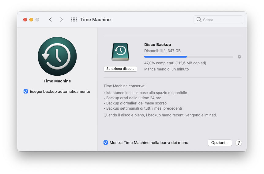 Chi lo desidera può ancora ottenere le indicazioni con il tempo stimato per completare il backup: basta aprire le Preferenze di Sistema e da qui la sezione “Time Machine” per avere una finestra con le indicazioni dei minuti restanti per completare la copia.