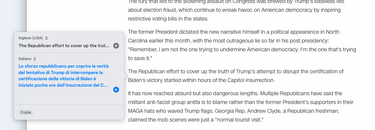 Tra le novità del futuro macOS Monterey, un servizio di traduzione dei testi a livello di sistema, utilizzabile con qualsiasi applicazione che consente di selezionare testi. È possibile aprire una pagina web ad esempio in Safari, selezionare con il tasto destro del mouse (o equivalente combinazione con il trackpad) il testo di proprio interesse e da qui la voce “Traduci”. Il sistema consente di specificare la lingua di partenza scegliendo tra arabo, coreano, giapponese, francese, inglese, cinese mandarino, portoghese, russo, spagnolo e tedesco. È anche possibile ascoltare con voce sintetizzata il testo riprodotto con la giusta intonazione sia nella lingua di origine, sia in quella di destinazione. Le traduzioni non sempre sono perfette ma è il problema di questi sistemi è quello di sempre: traducono solo il senso letterale con risultati in alcuni casi comici o fuorvianti. È ad ogni modo un sistema certamente comodo per comprendere quantomeno il senso di un discorso o al volo il significato di alcune parole.