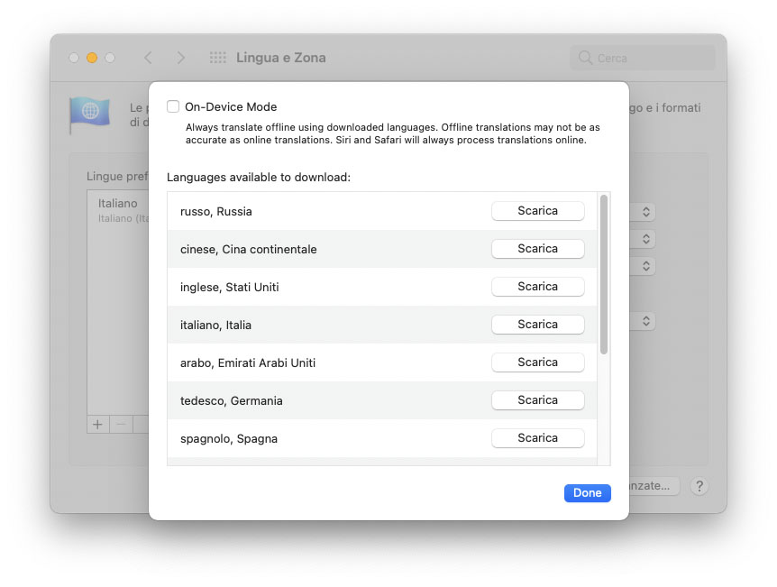 Oltre alle lingue indicate, dalla finestra popup che appare è possibile selezionare “Gestisci lingue”, da qui aprire la sezione “Lingue per la traduzione” e scegliere la modalità on-device (senza bisogno di connessione internet) scaricando le lingue desiderate.