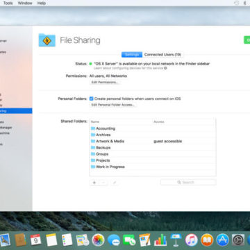 OS X Server non è più vincolato a una versione specifica del sistema operativo e funziona sia sui Mac con OS X Yosemite 10.11.6 sia su quelli con macOS Sierra 10.12. Come sempre mette a disposizione strumenti avanzati per condividere file, pianificare riunioni, sincronizzare contatti, ospitare siti web, accedere in remoto alla rete e molto altro ancora.
