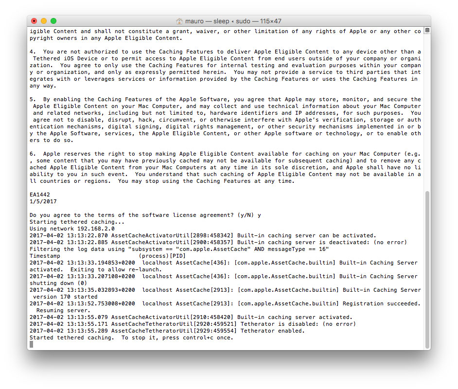 Per sfruttare il tethered caching serve un Mac con macOS 10.12.4 o superiore (collegato via Ethernet) e un dispositivo iOS con iOS 10.3 o superiore. Per l’attivazione del servizio, basta eseguire il login al computer come utente amministratore. digitare dal Terminale il comando: