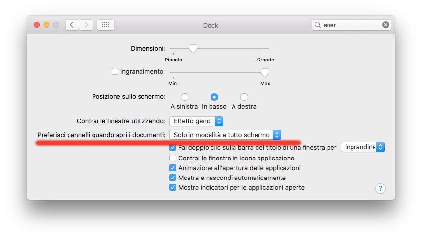Cambiano poco le preferenze concernenti il Dock. È possibile come sempre scegliere dimensioni, ingrandimento, posizione sullo schermo, la modalità per contrarre le finestre (effetto genio o effetto scala). Da qui è ad ogni modo possibile richiamare un’opzione che poco riguarda il dock: “Preferisci pannelli quando apri i documenti”, opzione che consente di scegliere tra “Solo in modalità a tutto schermo”, “Sempre” e “Manualmente”. Ricordiamo che una delle novità di macOS Sierra, è il supporto ai pannelli nelle applicazioni Mac che supportano le finestre multiple, fra cui Mappe, Mail, Pages, Numbers, Keynote e TextEdit, e anche in alcune app di terze parti. Grazie a questa funzione, è ad esempio possibile sfogliare diversi luoghi in Mappe senza perdere la visualizzazione attuale, copiare e incollare contenuti fra documenti Pages a schermo intero o passare rapidamente da una bozza all’altra in Mail.