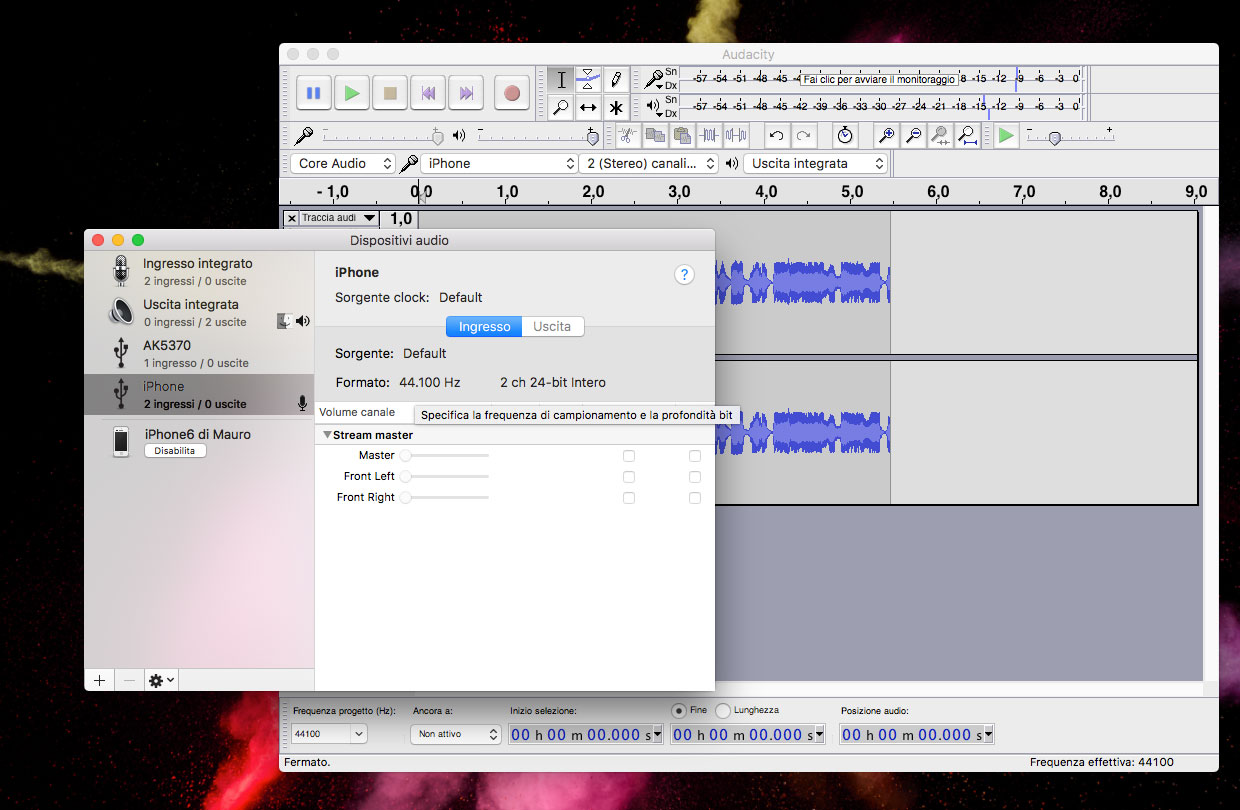 Selezionando l’iPhone come dispositivo dal quale accettare il suono in ingresso, sarà possibile registrare il suono di qualsiasi applicazione eseguita sull’iPhone (es. Skype, Whatsapp, Podcast, Spotify, ecc.) in GarageBand, Audacity e altri software simili per Mac. Non è possibile registrare ciò che viene pronunciato sul microfono dell’iPhone ma solo i suoni riprodotti dalle varie app.