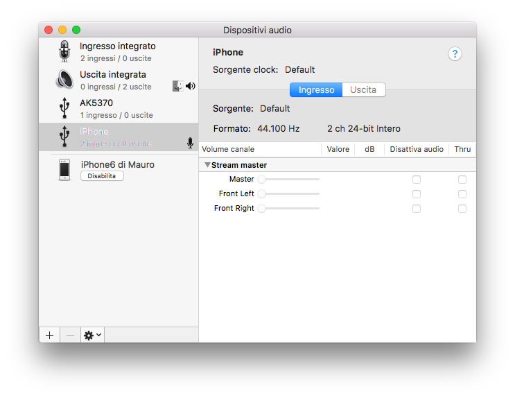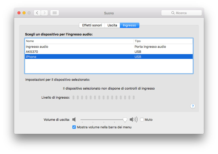 - Andando nella sezione “Suono” delle “Preferenze di Sistema” sarà possibile selezionare l’iPhone dispositivo audio di ingresso