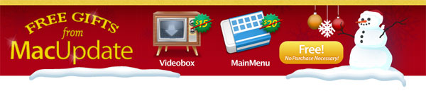 In occasione delle Festività e per ringraziare gli utenti Mac, MacUpdate offre in regalo due applicativi completi: Videobox e MainMenu. Il valore complessivo di listino dei due programmi è di 35 dollari: MacUpdate li offre in versione completa e gratuita a tutti gli utenti della Mela, senza alcun obbligo di scaricare e acquistare altri software.
